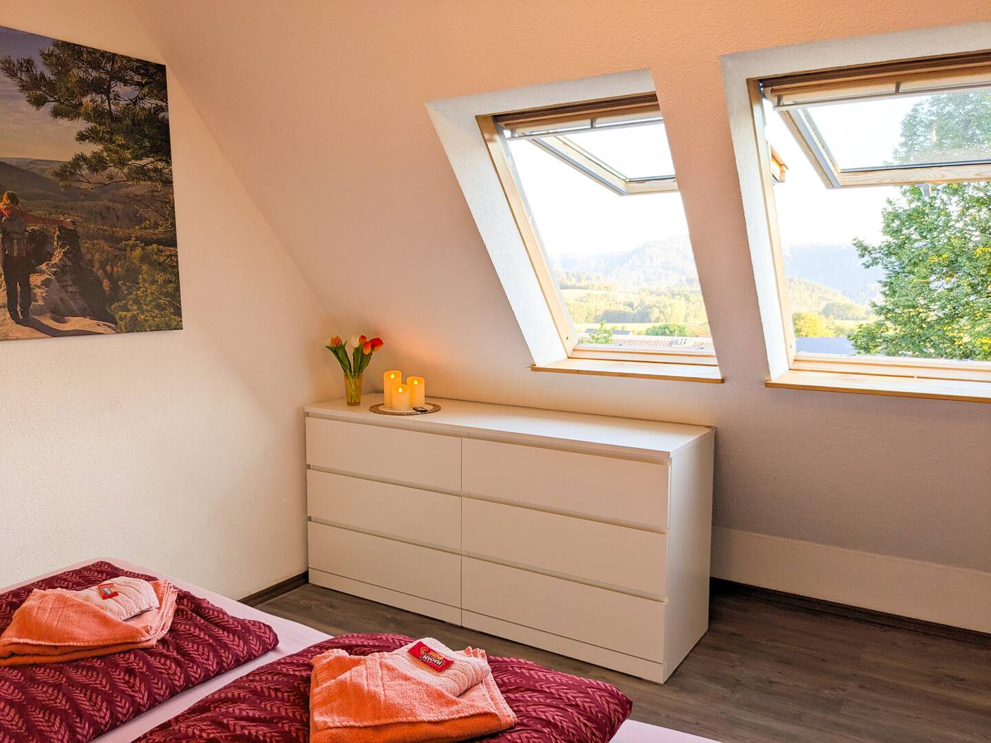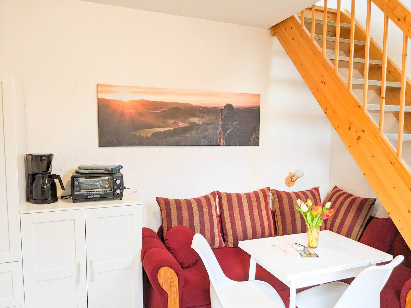 Die Unterkunft verfügt über 2 Zimmer, einen Balkon und ein Badezimmer mit Dusche. Auf dem Balkon ist genügend Platz für 4 Personen und ein Grill steht für euch bereit. In der unteren Ebene lädt ein gemütliches Sofa zum Verweilen oder Schlafen ein. Durch den Höhen verstellbaren Tisch könnt ihr dort auch bequem essen. Im Raum befindet sich außerdem eine voll ausgestattete Küchenzeile mit Miniofen und allem, was ihr sonst noch braucht. Zur oberen offenen Etage führt eine Holztreppe. Oben befindet sich der Schlafbereich mit einem 180m Bett. Dort könnt ihr auch in Ruhe Fernsehn schauen oder einfach den Blick aus dem Fenster genießen, denn von dort schaut ihr direkt auf die imposanten Felsgesteine des Elbsandsteingebirges.