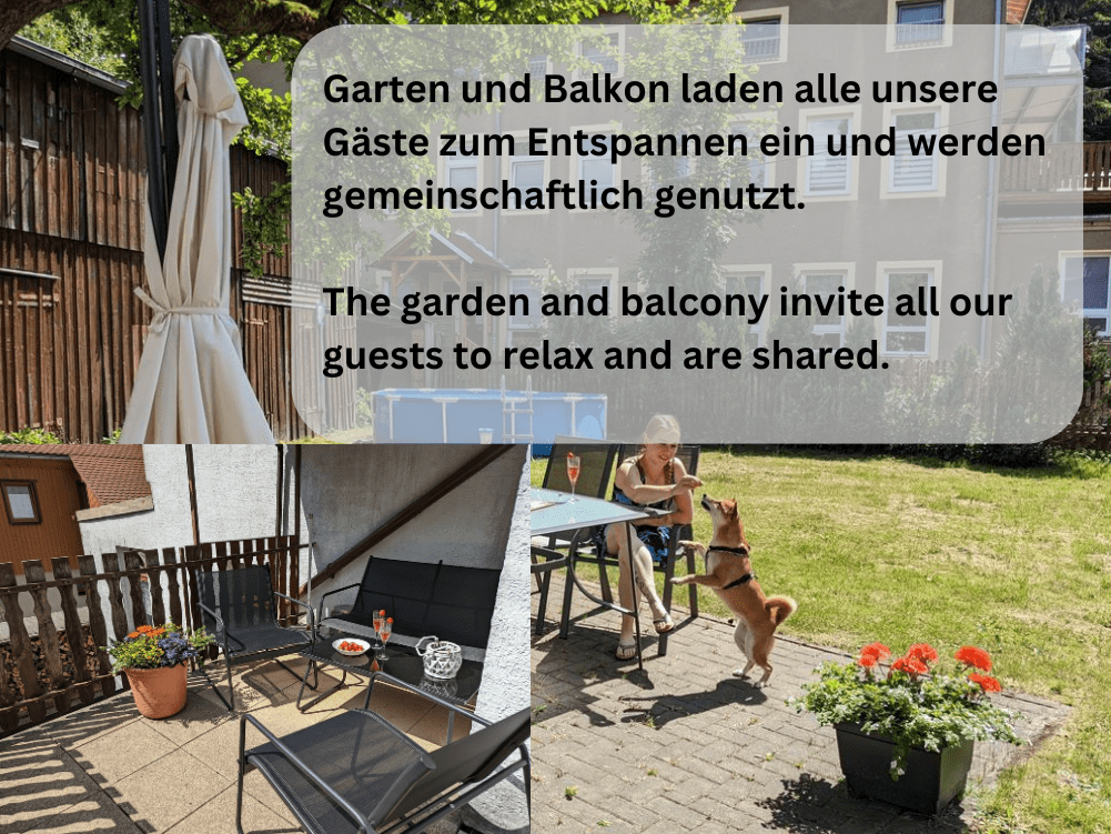Die Wohnung habt ihr ganz für euch alleine. Der Garten, die Terrasse, der Pool/Whirlpool und auch der Balkon können von all unseren Feriengästen benutzt werden. Im Garten gibt es dafür verschiedene Sitz- und Relaxecken, damit man sich nicht in die Quere kommt.