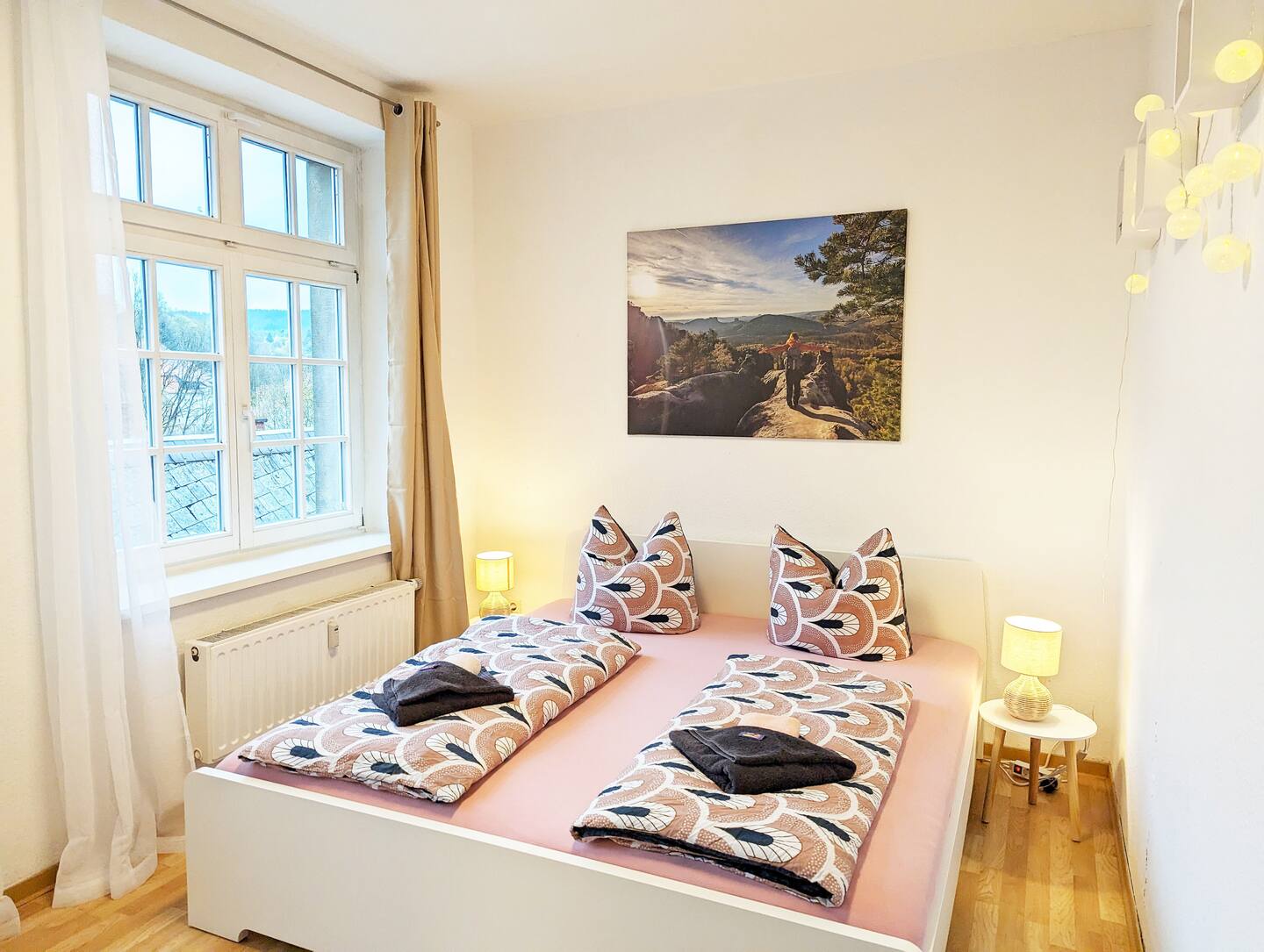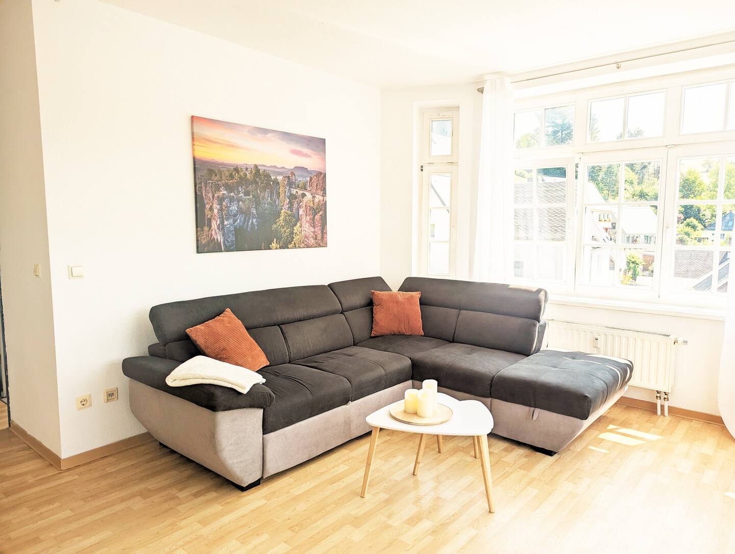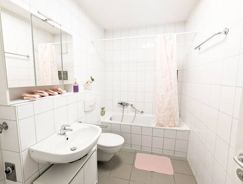 Geräumige, helle Wohnung mit 2 Schlafzimmern und einem großen Wohnzimmer mit Schlafcouch. Im dritten Stock gelegen, habt ihr von hier aus eine tolle Aussicht (beachtet: es gibt leider keinen Aufzug). In der voll ausgestatteten Küche könnt ihr leckere Mahlzeiten zubereiten. Im Gemeinschaftsgarten direkt gegenüber habt ihr im Sommer die Möglichkeit, den erfrischenden Pool zu genießen, die Füße im Fluss zu kühlen oder zu grillen. Dort steht euch außerdem jederzeit die Fasssauna zur Verfügung, um die Muskeln zu entspannen und es euch gut gehen zu lassen.