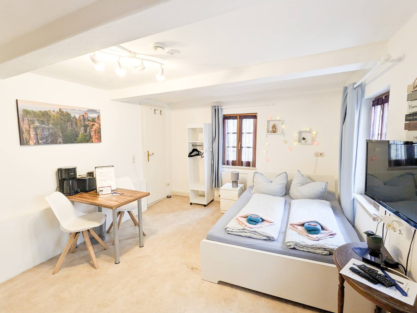 Gemütliche 1-Zimmer-Wohnung für 2. Hier findet ihr alles, was ihr für eine erholsame Auszeit braucht: eigenes Bad, kleine Küche, Esstisch und ein komfortables Bett – perfekt für einen entspannten Urlaub. Der Supermarkt und der Marktplatz mit Bäckerei und Läden sind zu Fuß erreichbar. Der Garten ist eine Ruheoase mit Fluss. Die Felsen der Sächsischen Schweiz erreicht ihr in nur 20 Minuten mit dem Auto oder Bus. Nach einem Wandertag könnt ihr in unserer Sauna oder im Sommer im Pool entspannen.
